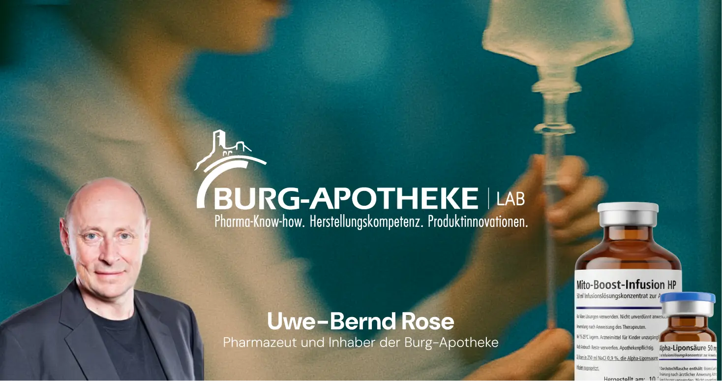 Mit der Burg-Apotheke als Partner entwickeln wir neuartige Infusionsanwendungen, die exklusiv für unsere Teilnehmer erhältlich sind. Gemeinsam bieten wir Ihnen eine einzigartige Kombination aus medizinischer Informationsvermittlung und innovativen Infusionslösungen – individuell entwickelt für Ihre Praxis oder Klinik.