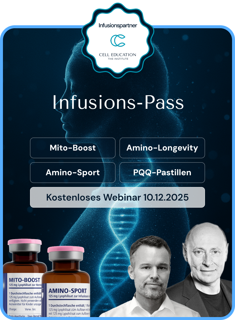 Im kostenlosen Webinar gibt Dr. Kay Bredehorst einen klaren Einblick in die biochemischen Grundlagen der zellulären Energie und zeigt, wie gezielte Infusionsstrategien die Regeneration, Leistungsfähigkeit und langfristige Gesundheit verbessern können. Außerdem erfahren Sie, wie Sie über den Infusionspass die Lizenz für unsere neuen Burg-Infusionen erhalten.