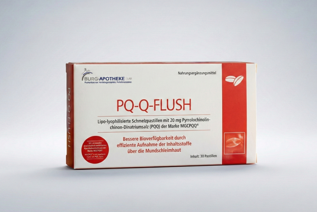 PQQ Flush ist ein ergänzendes Produktkonzept auf Basis von Pyrrolochinolinchinon (PQQ), das unter Berücksichtigung aktueller wissenschaftlicher Erkenntnisse entwickelt wurde. Es ist für die zeitlich begrenzte Anwendung im Rahmen individueller, ärztlich begleiteter Ernährungs- und Versorgungskonzepte vorgesehen.