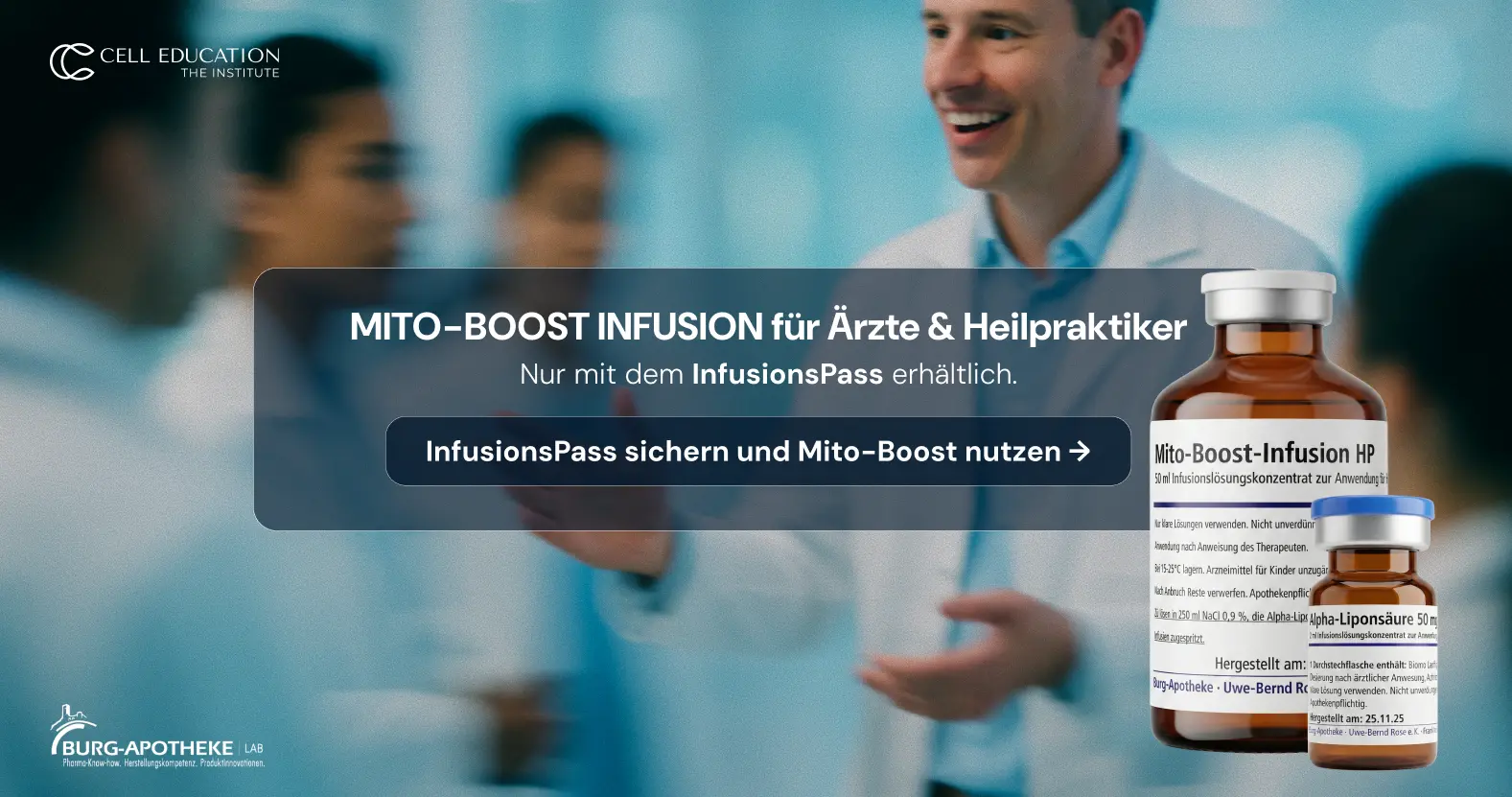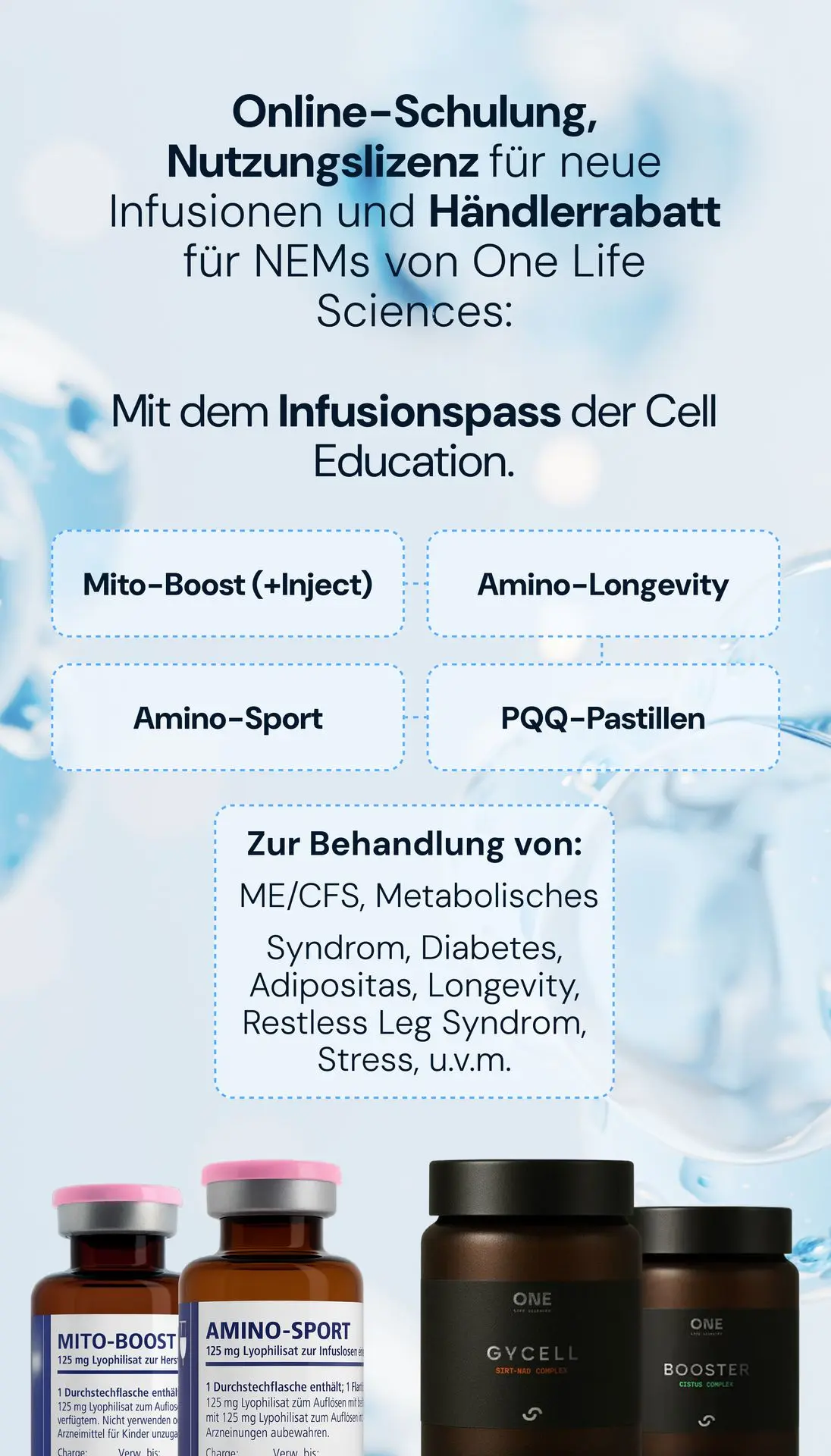Für nur 480,- € erhalten Sie das Grundwissen, um die Wirkung von Infusionen auf Zellebene zu verstehen sowie die Bezugslizenz für die innovativen und einzigartigen Infusionen Mito-Boost, Amino-Sport & Amino-Longevity.